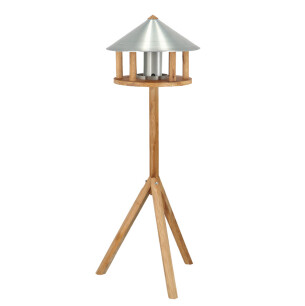 (Voedertafel eik met zinken dak op paal, € 99,50)