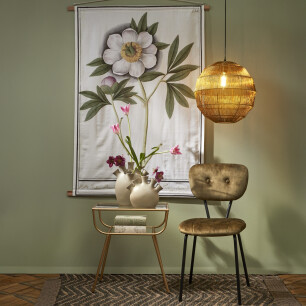 Geef je interieur een vintage vibe met deze prachtige bloemenposter. Op het stevige katoenen doek staat een betoverende pioenroos afgebeeld, compleet met een charmante beschrijving van de bloem in elegant handschrift.