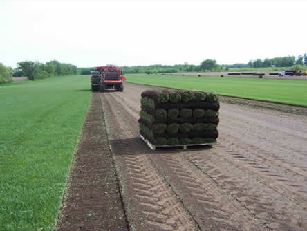 Oogsten van graszoden wordt machinaal gedaan op perfect onderhouden kweekgazons