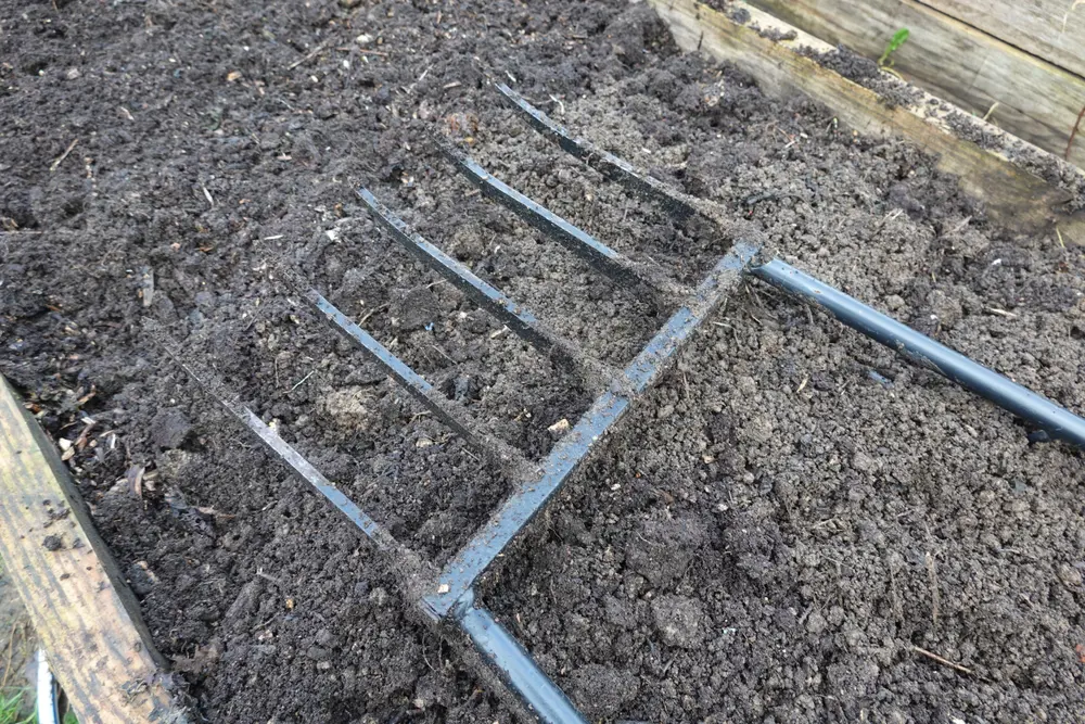 Dans notre jardin, le potager, nous retrouvons une fois de plus un vieux mécanisme, la fourchette ou grelinette.