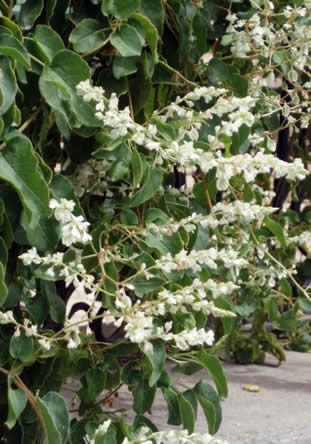 In een landelijke tuin is vaak nog een of ander hok of bouwsel dat best aan het oog wordt onttrokken. Klimop doet dat, maar ook de Chinese bruidssluier, Fallopia aubertii. Het is een opvallend snelgroeiende zeg maar onstuimige slingerplant, minder geschikt voor een kleine tuin. De witgroene bloempjes verschijnen in de zomer en worden na de bevruchting enigszins roze.