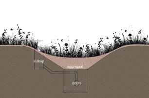 Hieronder zie je een illustratie van een wadi als deze onder water staat. Het regenwater wordt door de toplaag van de wadi gezuiverd en zakt langzaam terug in de bodem. Als er te veel water in de wadi komt zal via de slopkop het overige water worden opgeslagen en door de drain worden afgevoerd.