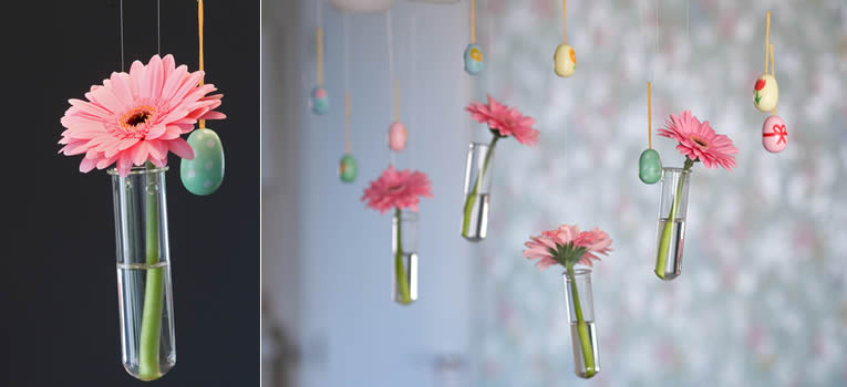 Haal wat takken van de krulwilg of krulhazelaar naar binnen en versier ze met zelfgeschilderde paaseitjes. Het is ook leuk om boven de tafel aan je verlichting bloembuisjes te hangen met mooie bloemen zoals Gerbera’s aangevuld met paasdecoratie. Neem bloembuisjes die breed genoeg zijn, bij voorkeur buisjes van 2.5 cm diameter. Met de twee voorziene gaatjes in de buisjes en een nylondraadje kan je ze eenvoudig ophangen.