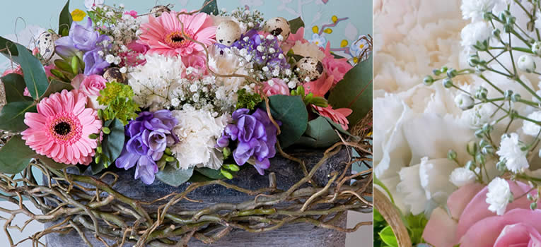 • Bloemen met zachte kleuren: gerbera, rozen, anjers, fresia, gypsophila,….