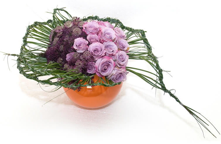 1. Maak een boeket van je bloemen. Op de foto zijn de bloemen niet gemengd maar werden de rozen aan de ene kant geschikt en de Astrantia en Trachelium aan de andere zijde van het boeket. Je kan de bloemen natuurlijk ook door elkaar schikken.