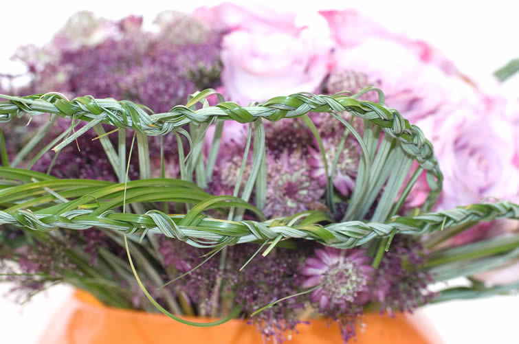 4. Vlecht het berengras in verschillende lagen. Begin met 6 grasjes (3x2) en maak een vlecht. Werk de andere grasjes systematisch in de vlecht zodat je één geheel krijgt.