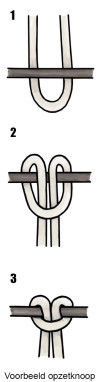 • Hou de stroken dubbel en knoop ze met een opzetlus aan de hoepel. Start bovenaan naast het touw. Leg de lus over de hoepel, trek de lus naar achteren om de hoepel en haal de uiteinden van het garen door de lus. Hou het garen zo dicht mogelijk vast aan de gemaakte knoop en span voorzichtig aan. Zorg dat de uiteinden onderaan de hoepel zitten. Knoop het garen tot er aan beide zijden 5 strengen hangen.
