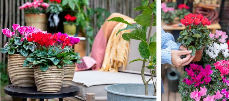 Zet garden cyclamen op een plekje in de halfschaduw. Wanneer je ze in een pot zet, zorg dan dat er een gat in de bodem zit. Overtollig (giet)water kan dan eenvoudig wegvloeien. Belangrijk is om cyclamen op de juiste manier water te geven. Doe dat namelijk aan langs de zijkanten van de pot en niet in het midden van de plant, zoals je misschien gewend bent. Of geef water via een schoteltje onder de pot. Het is namelijk beter als de wortels van de cyclaam het vocht van onderaf opzuigen. Haal de uitgebloeide bloemen met steel en al uit de plant. Onder de ‘rokken’ ontstaan dan vanzelf nieuwe knoppen.