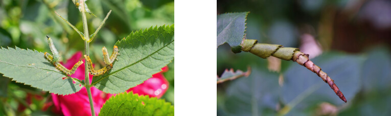 v.l.n.r.: rupsen van de rozenbladweps - een opgekruld rozenblad na het leggen van eitjes.