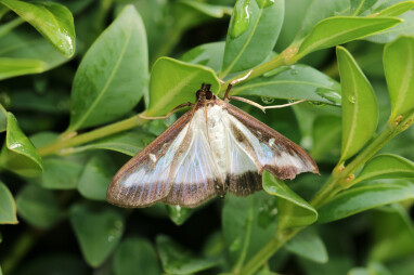 • De rupsen ontpoppen zich tussen de bladeren van de buxus tot een helderwitte nachtvlinder met een bruine rand rondom de vleugels. Zowel de kop als het achterlijfje van de buxusmot zijn bruinkleurig. Uitzonderlijk kan de mot ook helemaal bruin zijn. De motten hebben een grootte van 4 cm en vliegen vooral 's nachts.