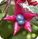 Na de bloei worden blauwe bessen gevormd waarrond de rode schutblaadjes blijven zitten. Zeer decoratief in een herfstbloemstuk. De variëtiet fargesi heeft iets grotere bloemen.
