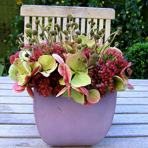 • Een viekant recipiënt, kleur dat ook bij je sedum en hydrangea past, dus iets in het kleurenpalet met een tintje van het basiskleur rood in; maar je kunt ook een andere kleur gebruiken, die jij mooi vindt.