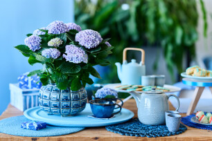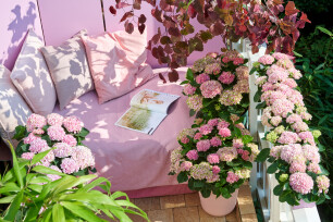 Magical hortensia's doen het ook uitstekend op het balkon of terras. De Magical Evolution is bijvoorbeeld zeer geschikt voor in potten. De plant blijft met z'n hoogte van 75 cm lekker compact en is daarom ideaal als je weinig ruimte op je balkon of terras hebt. Hortensia's houden van voldoende vocht, geef dus zeker in droge tijden regelmatig water. Belangrijk is dat in de bodem van de pot een afwateringsgat zit zodat overtollig water kan weglopen. Tijdens de zomermaanden af en toe verwennen met plantvoeding resulteert in een extra rijke en lange bloei.