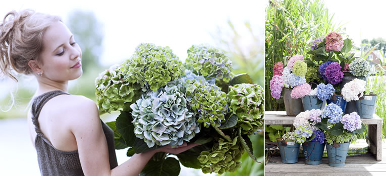 Hortensia’s zijn dol op kleur. Ze zijn er in alle tinten rood, roze, paars, wit, groen en blauw, maar er zijn ook hortensia’s die meerdere kleuren combineren. Naast frisse tinten, zijn er ook zogenaamde doorgekleurde bloemen. Deze hortensia’s hebben een groen/rood/bruine tint en laten zich goed drogen. Ook qua vorm kun met deze no-nonsense bloem vele kanten op. Ga voor bolvormige hortensia’s, hortensia’s met kleine bloemetjes in het midden en grote bloemblaadjes aan de rand (randbloeiers) of hortensia’s met een pluimachtige vorm.Verzorgingstips :