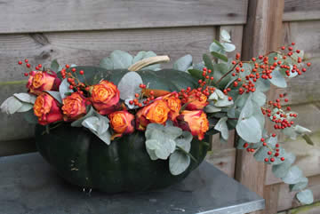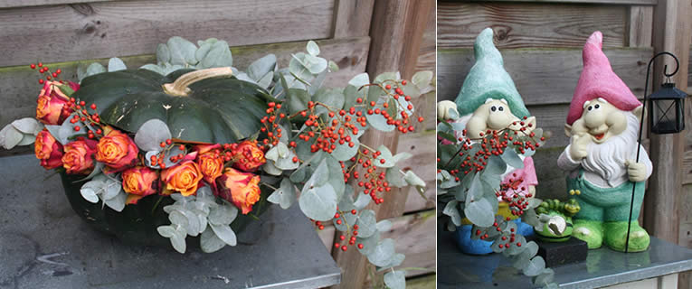 Remplissez une citrouille de roses et d’eucalyptus. Lisez ici ce dont vous avez exactement besoin et comment le fabriquer.