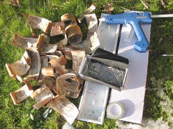 Knip of scheur ongeveer gelijke schorsrepen en speld deze op de isolatieplaat. Zorg dat je een rechtopstaande rand hebt van een aantal centimeter.