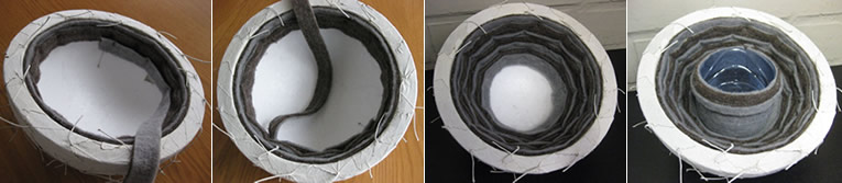 - Snij de helft van het vilt in repen en speld deze aan de binnenkant van de isomobol. Ik heb tweekleurig vilt gebruikt en afwisselend de bruine en grijze kant gebruikt.