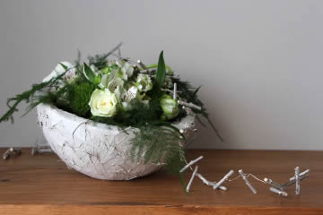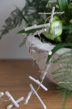 - Als finishing touch maken we een slinger van de witte abeeltakken: knip de takken op +- 4à 5 cm. Neem een lange klosdraad, wikkel een 3 tal keer rond een takje en tors de draden met elkaar, wikkel het volgende takje na een aantal cm en tors terug beide draden. Ga zo verder tot je de gewenste lengte hebt. Drapeer de slinger over je bloemstuk.