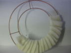 • Onderaan wordt de woldraad (met ijzerdraad in) herhaald en ook vastgemaakt met decoratieve etalagespelden.