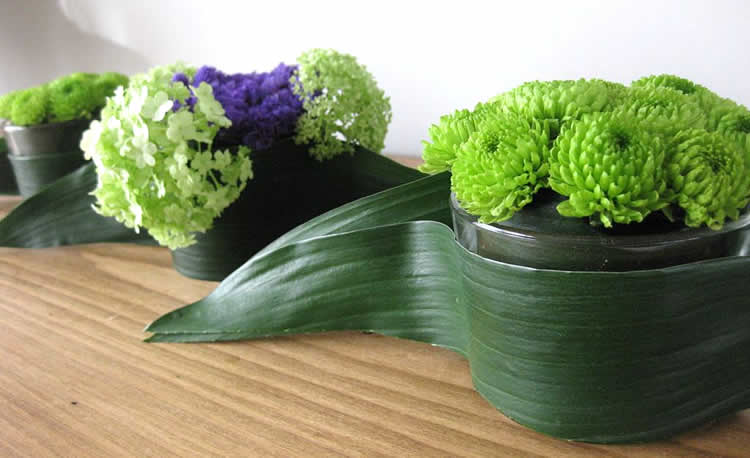 • Snij de oasis op maat maar zorg dat het niet geklemd zit in het glaasje. laat volzuigen met water, wikkel hierrond ook een blad en steek dan in je glaasje. Mocht het blad los komen kan je er een etalagespeld of kopspeld in prikken.