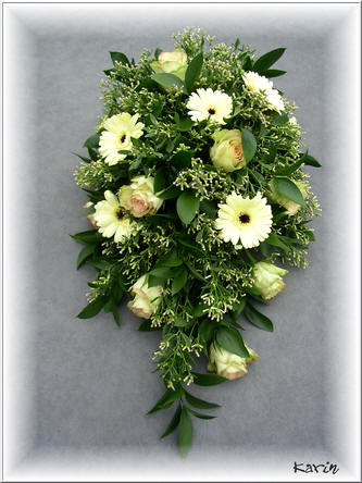 Voor het langwerpig grafstuk werkt men op een punt, men houdt de halve bol bovenaan maar steekt de materialen langs de ene kant op een puntvorm! Ook hier geldt de regel dat alles naar één denkbeeldig middelpunt gestoken wordt!