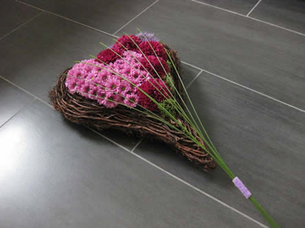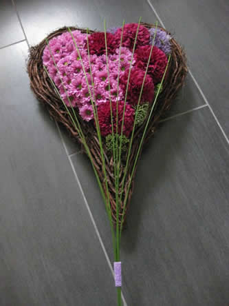 - Het recipiënt: een takkenconstructie in de vorm van een hart. Deze is aangekocht en een ander bloemstukje met dit hart kan u terugvinden: “hart voor Allerzielen”.