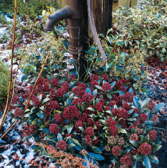 La Skimmia est magnifique en hiver, avec une touche de printemps. Ce n’est pas sans raison que Skimmia japonica 'Rubella' soit une espèce largement cultivée pour les jardins.