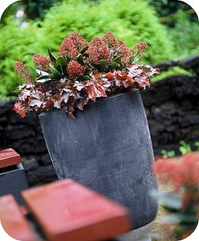 Ook al is de Skimmia op zichzelf al mooi genoeg, het kan nóg leuker door de plant te combineren met een bladhoudende vaste plant. Durf daarbij te spelen met kleur. Het donkerrode blad van de Heuchera, geeft een extra accent aan de bloemknoppen van de Skimmia. Heuchera’s zijn winterharde vaste planten, die net als de Skimmia ’s winters nog bladeren hebben. Ze zijn er trouwens niet alleen met donkerrode bladeren, maar in kleuren variërend van groen tot donkerbruin en oranjegeel.Natuurlijk zijn er meer struikjes met sierwaarde in de winter. Leuke besdragers voor het winterterras zijn bijvoorbeeld Skimmia met bes, bergthee of Gaultheria Pernettya of hulst met mooie besjes.