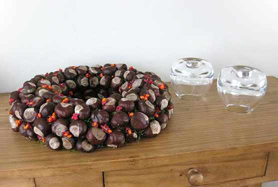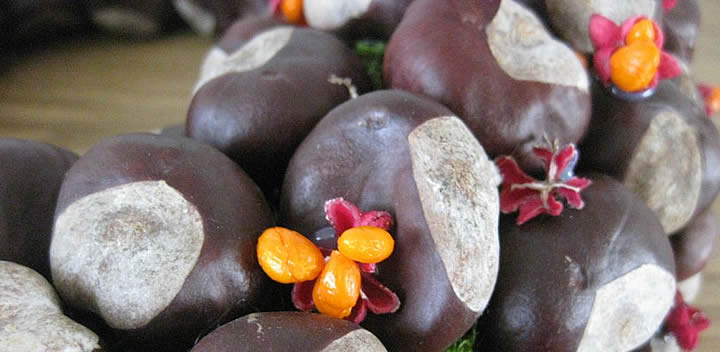 • Kleef de vruchtjes van de Euonymus her en der tussen de kastanjes.