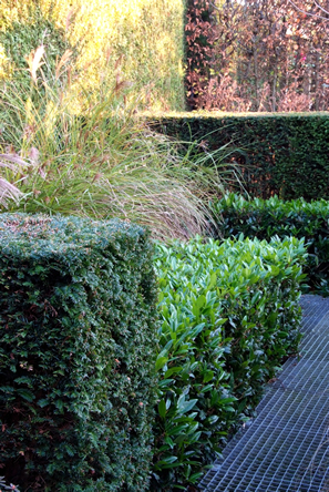 Vooraan Taxus en midden heel mooi en sterk: laurierkersen (Prunus laurocerasus)