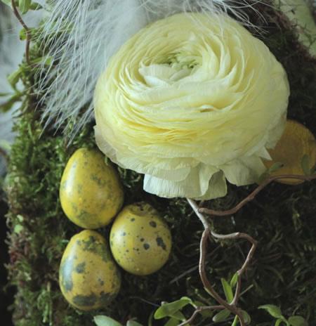 Heb je geen gekleurde houtschijfjes ? Gebruik dan houtschijfjes in naturel kleur of verf deze samen met je kind – kleinkind.  Stem alle kleuren op elkaar af – werk dus ton sur ton.  Herhaling is altijd aan te raden : 1ei opmaken zal mooi zijn maar maak je meerdere dan is het effect des te groter en komt het geheel heel wat mooier uit. Zeker als je dit zou maken voor een paastafel.  Andere bloemen die hier zeker toepasbaar zijn : Germini  ,witte fijne Allium bloem, een dubbel tulpje…  Geen al te stijve bloemen : een roos bijvoorbeeld zou minder geslaagd zijn.