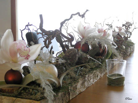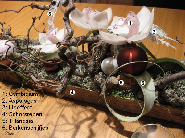 Indien je deze compositie niet specifiek op tafel wenst te zetten maar bijvoorbeeld op een dressoir kan je nog een extra laag of hoogte voorzien door over de hele breedte lange asparagustakken te steken ipv hier en daar een accent in een kerstbal.