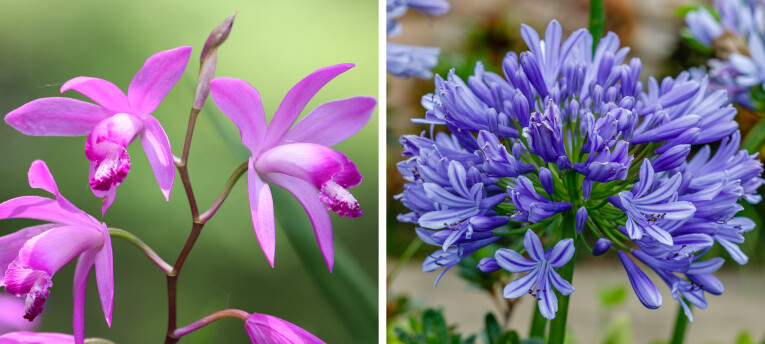 • Bletilla striataaardorchidee of Japanse orchis, is een moerasplant met zwaardvormige bladeren. Van juni tot juli verschijnen fraaie, paarse bloemen die zo’n 35 cm hoog worden. De bloemen hebben een drielobbige onderlip waarbij de onderste geelwitte strepen heeft. Plant ze op een plek met lichte schaduw in een vochtige, goed doorlatende, vruchtbare grond. Deze tuinorchis prefereert een vochtige grond maar is toch ook vrij droogtetolerant. Bletilla is redelijk winterhard maar stelt een beschermende mulchlaag wel op prijs.