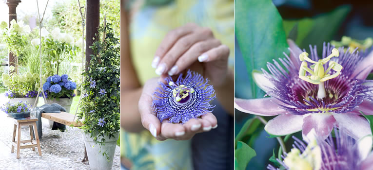 De passiebloem met haar nonchalante, klimmende groeiwijze past heel goed bij de pure, robuuste, verwilderde en natuurlijke uitstraling van ‘Unexpected Wild’, één van de tuintrends van 2015. Zet de plant in een betonnen bak of een terracotta pot. Voeg daarbij hortensia’s of petunia’s met bloemen in alle schakeringen blauw om de sfeer te versterken. Siergrassen zorgen voor een luchtig accent.Tips
