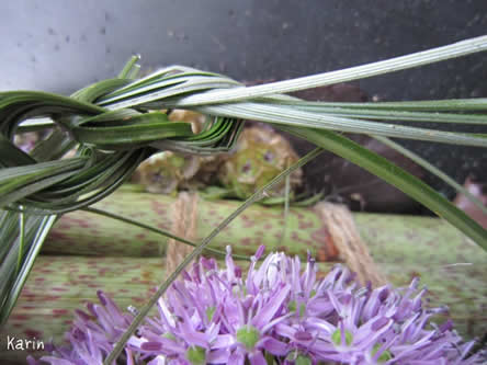 • Als laatste neem je 2 bundeltjes Beregras en knoop deze over het bloemstuk heen.