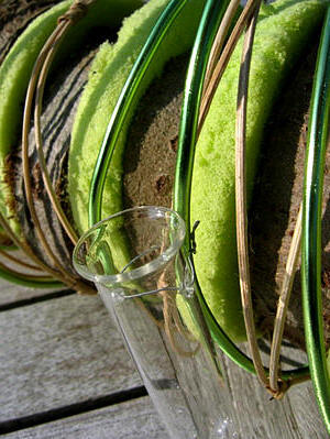 • Pitriet tot een spiraal binden met oasisdraad. Er op letten dat je telkens de andere kant van de cirkel bindt en je goed de uiteinden van het pitrietringen bedekt. Je kunt de binding plat houden door de binddraad gewoon 3 x stevig rond het pitriet te draaien en af te knippen. Als je knoopt, zie je meer een dikte. Je cirkels moeten absoluut groter dan de diameter van je grootste schijven zijn, want het pitriet moet er over kunnen.