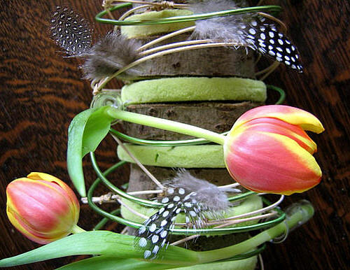 Voor Pasen kun je kwarteleitjes op lijmen en/of pluimpjes er tussen verwerken. Eitjes of piepkleine nepkuikentjes kun je ook verwerken.