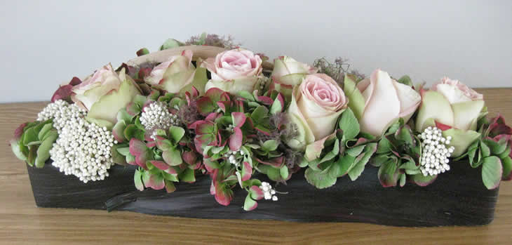 Andere materialen die je eventueel hierin kan verwerken is: witte sneeuwbes met bijvoorbeeld rode rozen. Tuinmaterialen:  Een rankje van de clematis, Sedum, Malus appeltjes, besjes, Viburnum bessen, Hypericum bessen, een mooie tak hierin verwerken, stukjes plataanschors….