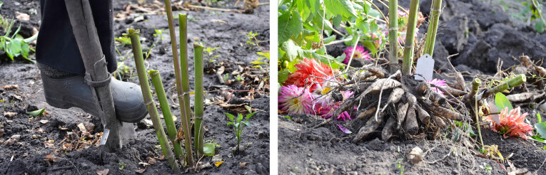 Haal de knollen uit de grond en hou er rekening mee dat ze vrij groot kunnen zijn. Wees dus voorzichtig als je de spade in de grond steekt want beschadigde knollen hebben ook een grotere kans op uitdrogen of rotten. Knip de uitgebloeide stengels een paar centimeter boven de knol af en maak ze niet al te proper. Er mag gerust nog wat aarde blijven aanzitten. Wikkel ze in wat krantenpapier en leg ze op een droge en koele plaats in een doos of krat. Eens de kans op nachtvorst, rond eind april of mei geweken is, kunnen de knollen terug de grond in.
