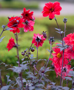 Eén van de eerste nieuwere Dahlia’s die aan de verbetering van het imago heeft bijgedragen, is Dahlia “Bishop of Llandaff”, een scharlakenrode bloem die halfgevuld is, waardoor de gele meeldraden goed te zien zijn. Het feller rood van de bloem steekt mooi af tegen het donkere blad dat zelfs voor de bloei heel decoratief is. Het blad is zeer donker, diep ingesneden en wat varenachtig. De pittige kleur vraagt wel om goed uitgekiende combinaties. Combineer het felle rood met Artemisia en laat het terugkomen in Lobelia “Queen Victoria”. Of geef de rode bloemen de rol van accent in een perk met veel groen of met siergrassen.