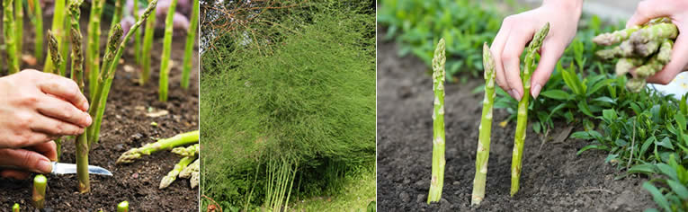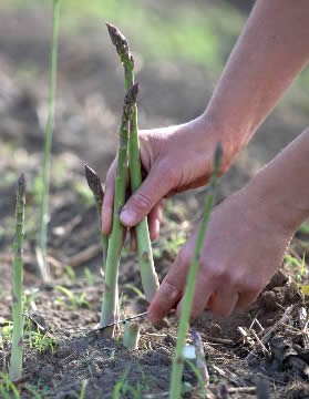 In het vroege voorjaar kunnen de asperges worden aangeplant, waarbij jonge planten het beste resultaat opleveren. Het eerste jaar mag je nog niet oogsten en de oogst in het tweede jaar zal nog niet optimaal zijn. Pas in het derde jaar kan je maximaal oogsten. Oogst de groente als ze 15 à 20 centimeter groot zijn door ze net aan het oppervlak af te breken of te snijden met . Na 10 tot 12 jaar zijn de planten uitgeput en kun je best nieuwe planten op een ander plekje in de tuin.