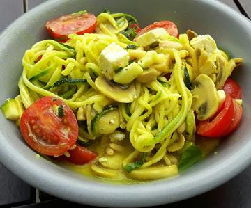 Spoel de courgette en verwijder de uiteinden. Maak spaghetti van de courgette met een spiraalsnijder. Reinig de champignons en bak ze in wat olijfolie. Voeg tijdens het bakken een teentje knoflook toe, peper en zout en het sap van een halve citroen. Bak na de champignons de pijnboompitjes kort even bruin. Spoel de kerstomaten en snijd ze in 2 helften. Doe in een pan wat kokosmelk en voeg de kruiden (kurkuma, curry, paprikapoeder en zout) toe naar eigen smaak en laat even inkoken. Meng dan de courgettespaghetti, de gebakken champignons, de kerstomaten en pijnboompitjes onder de saus. Werk af met wat versnipperde verse basilicum en fetakaas. Naar smaak kan je bijvoorbeeld nog wat gerookte zalm toevoegen.