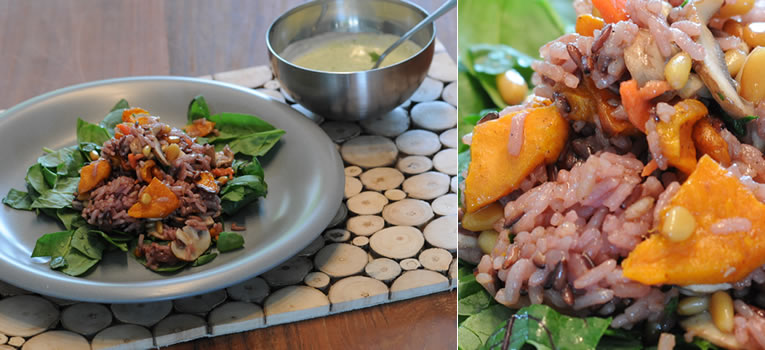8. Leg op je bord wat blaadjes spinazie en schep er de rijst bovenop. Serveer samen met het koele sausje en geniet van dit heerlijk recept.
