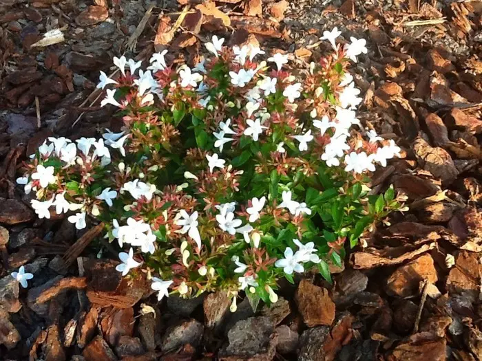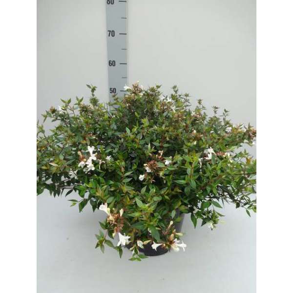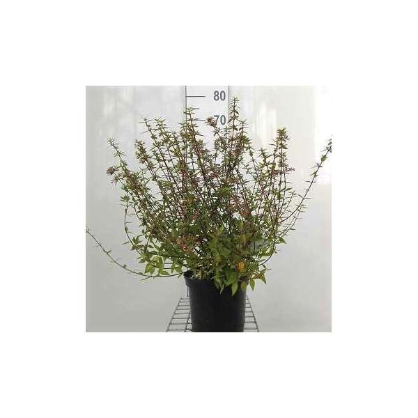 Abelia x grandiflora 'Prostrata' est un arbuste compact et large, aux feuilles vertes qui prennent une belle décoloration violacée au bord des feuilles en automne.