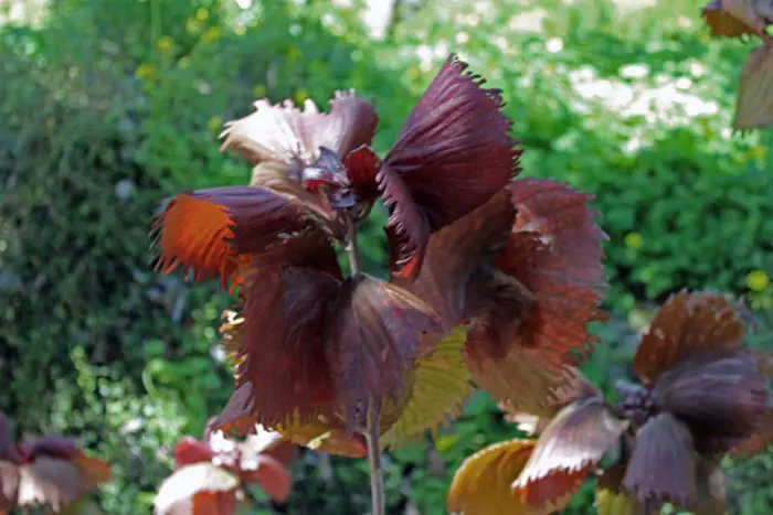 Les feuilles légèrement dentelées et finement velues sont brun-rouge à vert bronze, tachetées ou veineuses. Plus couleur cuivre au soleil, plus violette à la lumière filtrée ou à l’ombre partielle.