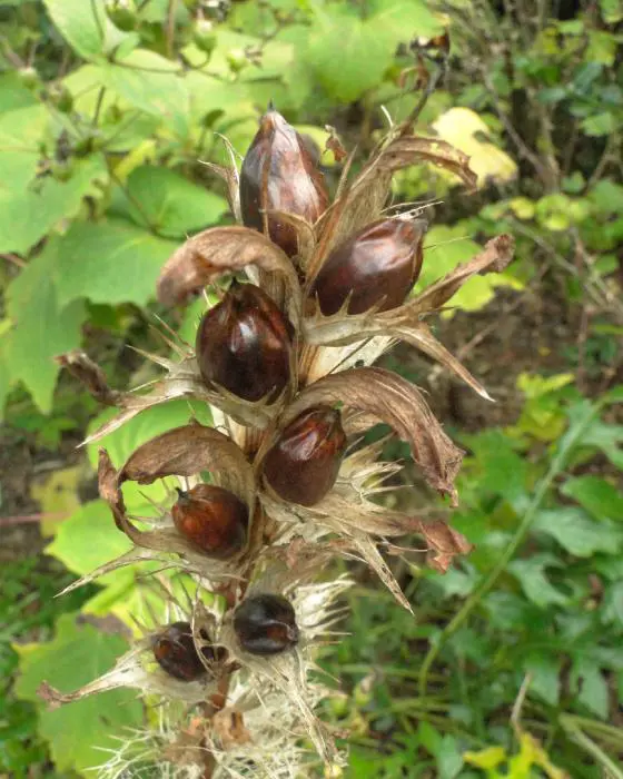 Cette espèce développe de grandes feuilles brillantes, fortement incisées et vert foncé.