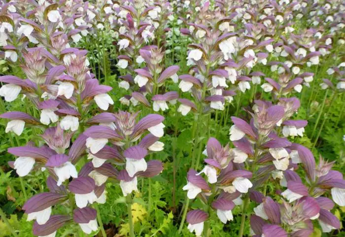 En été, les hautes pointes fleurissent avec des fleurs blanches et des bractées épineuses, ternes et violettes, et après la floraison, elles restent décoratives jusqu’à l’automne.