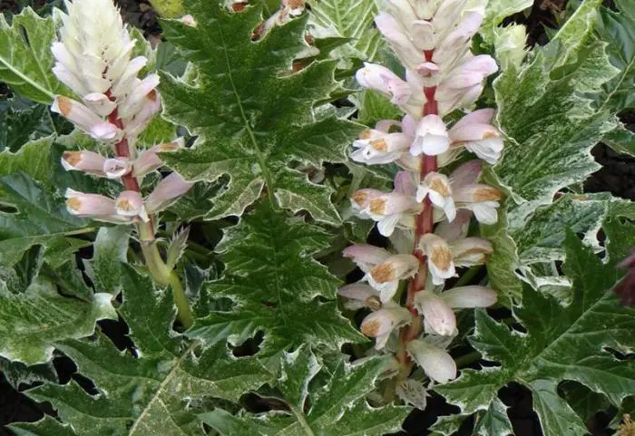 Cette variété est très originale avec ses fleurs blanches et ses bractées rose-blanc ! Magnifique avec ses feuilles vert foncé fortement incisées, éclaboussées de taches blanches crème.