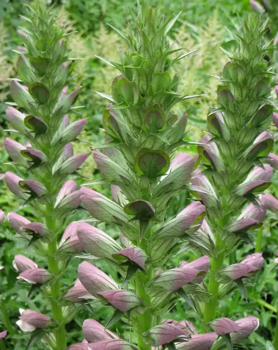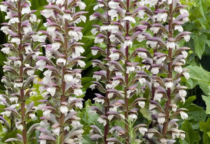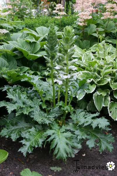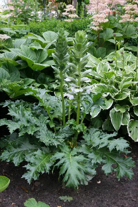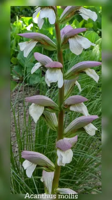 Acanthus mollis est une vivace majestueuse à grande valeur ornementale qui donne de la structure au jardin grâce à ses grandes feuilles et ses fleurs en forme de pointe.