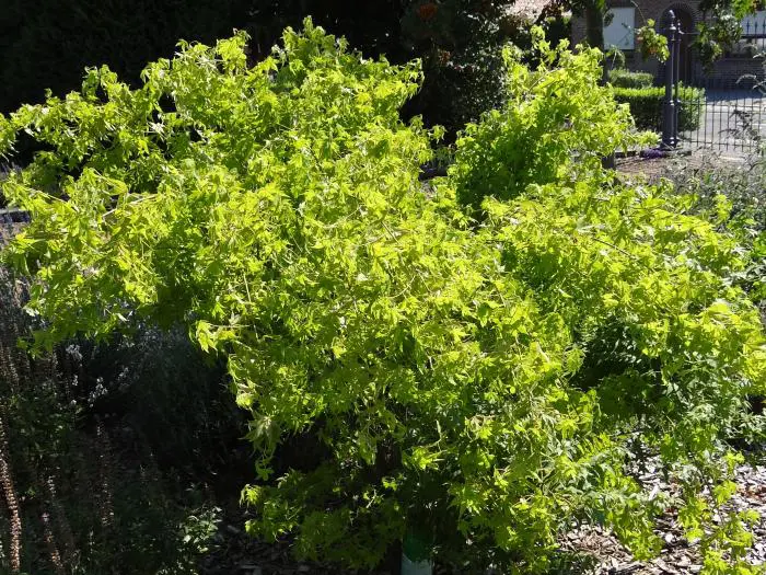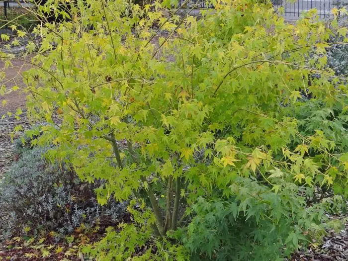 Acer palmatum 'Aoyagi' est un arbuste ou petit arbre droit et feuillu caduque, avec une écorce verte fraîche et des feuilles palmées vert vif qui jaunissent à l’automne.